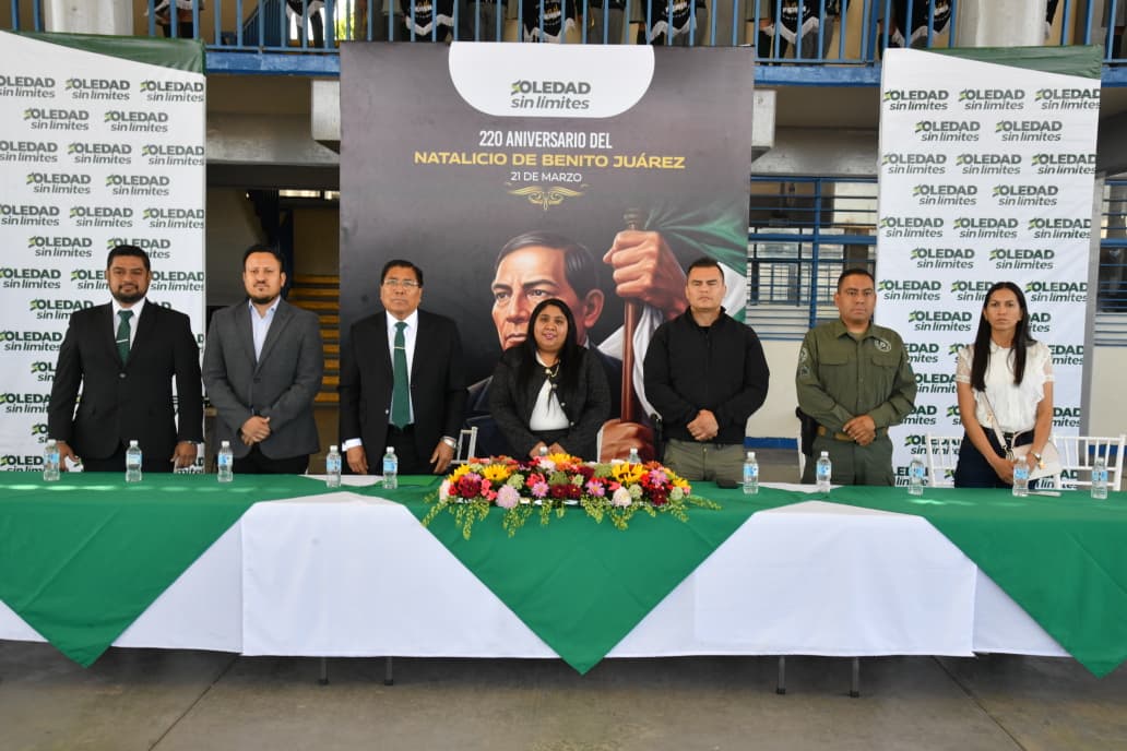 En un emotivo acto cívico y como parte del rescate de los valores que dan identidad a nuestro país, autoridades del Ayuntamiento de Soledad de Graciano Sánchez, encabezadas por la Dirección de Educación y Acción Cívica, conmemoraron el 220 aniversario del natalicio del Benemérito de las Américas, Benito Juárez García, en la explanada de la Secundaria “21 de Marzo de 1806″, donde se reunieron estudiantes, directivos, madres y padres de familia para recordar su legado histórico.
