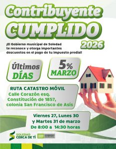 Este esquema de descuentos, reconoce la responsabilidad de las y los soledenses cumplidos, quienes recibieron un descuento en enero del 15 por ciento, en febrero del 10 por ciento, y en marzo del 5 por ciento, favoreciendo la protección de la economía familiar e incentivando el cumplimiento de las obligaciones fiscales, lo cual redunda en la garantía de los servicios públicos básicos en todo el territorio de Soledad de Graciano Sánchez.
