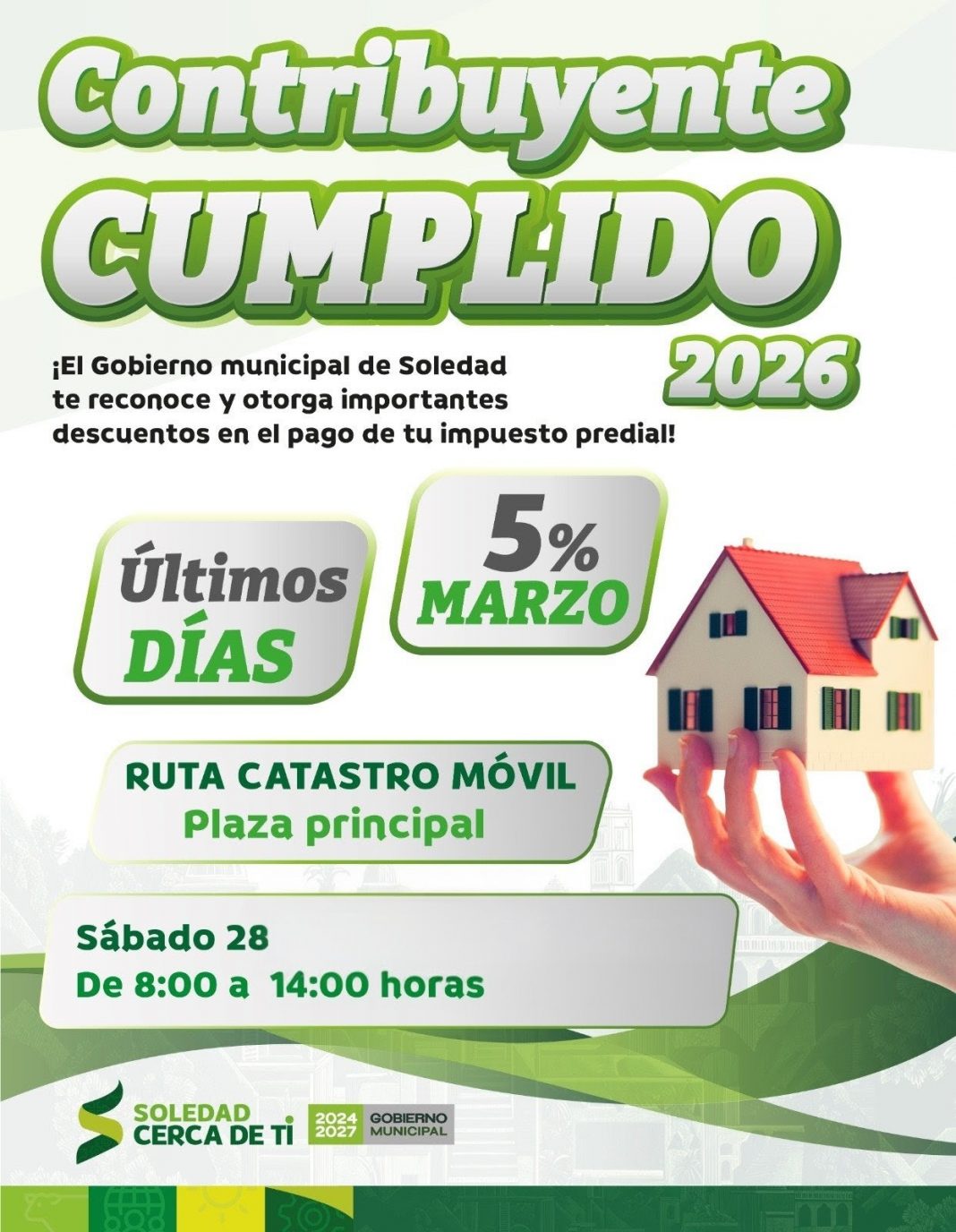Este esquema de descuentos, reconoce la responsabilidad de las y los soledenses cumplidos, quienes recibieron un descuento en enero del 15 por ciento, en febrero del 10 por ciento, y en marzo del 5 por ciento, favoreciendo la protección de la economía familiar e incentivando el cumplimiento de las obligaciones fiscales, lo cual redunda en la garantía de los servicios públicos básicos en todo el territorio de Soledad de Graciano Sánchez.