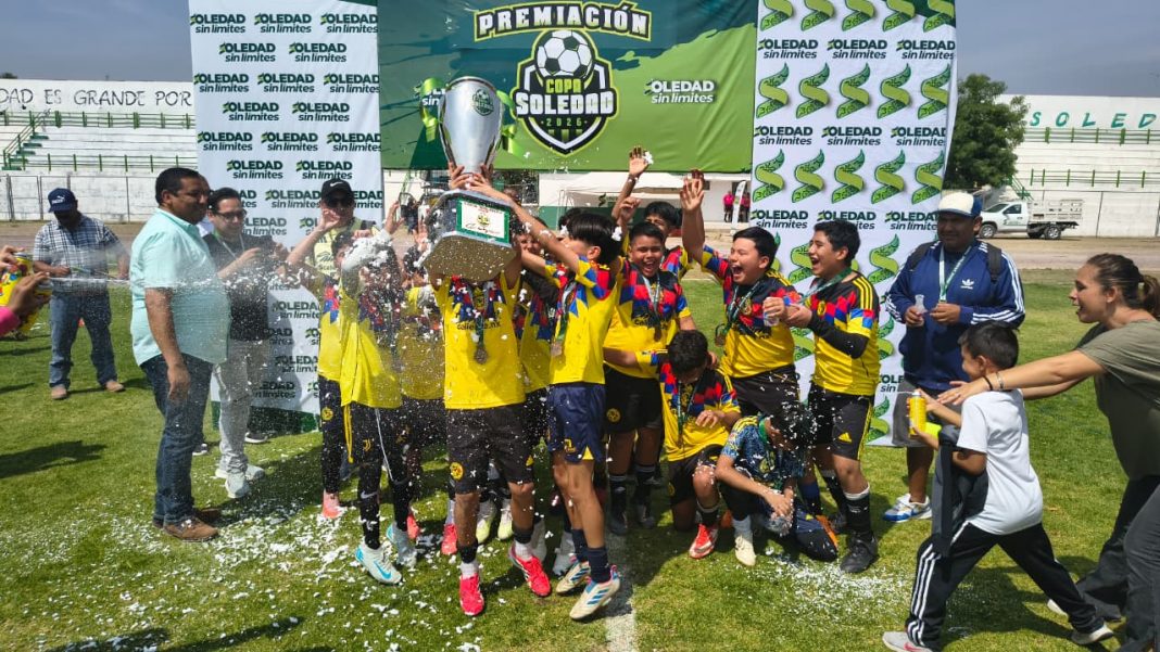 Tras una semana de alta competencia, las escuadras de Peñarol FC en la categoría 16-17 y Cefor Nido Aguila en la categoría 14-15, se proclamaron campeones de la Copa Soledad Infantil 2026, cotejos que se efectuaron en el campo 1 de la Unidad Deportiva “21 de Marzo” de la colonia San Antonio en Soledad de Graciano Sánchez, en el marco de las actividades deportivas de la Feria Nacional de la Enchilada 2026.